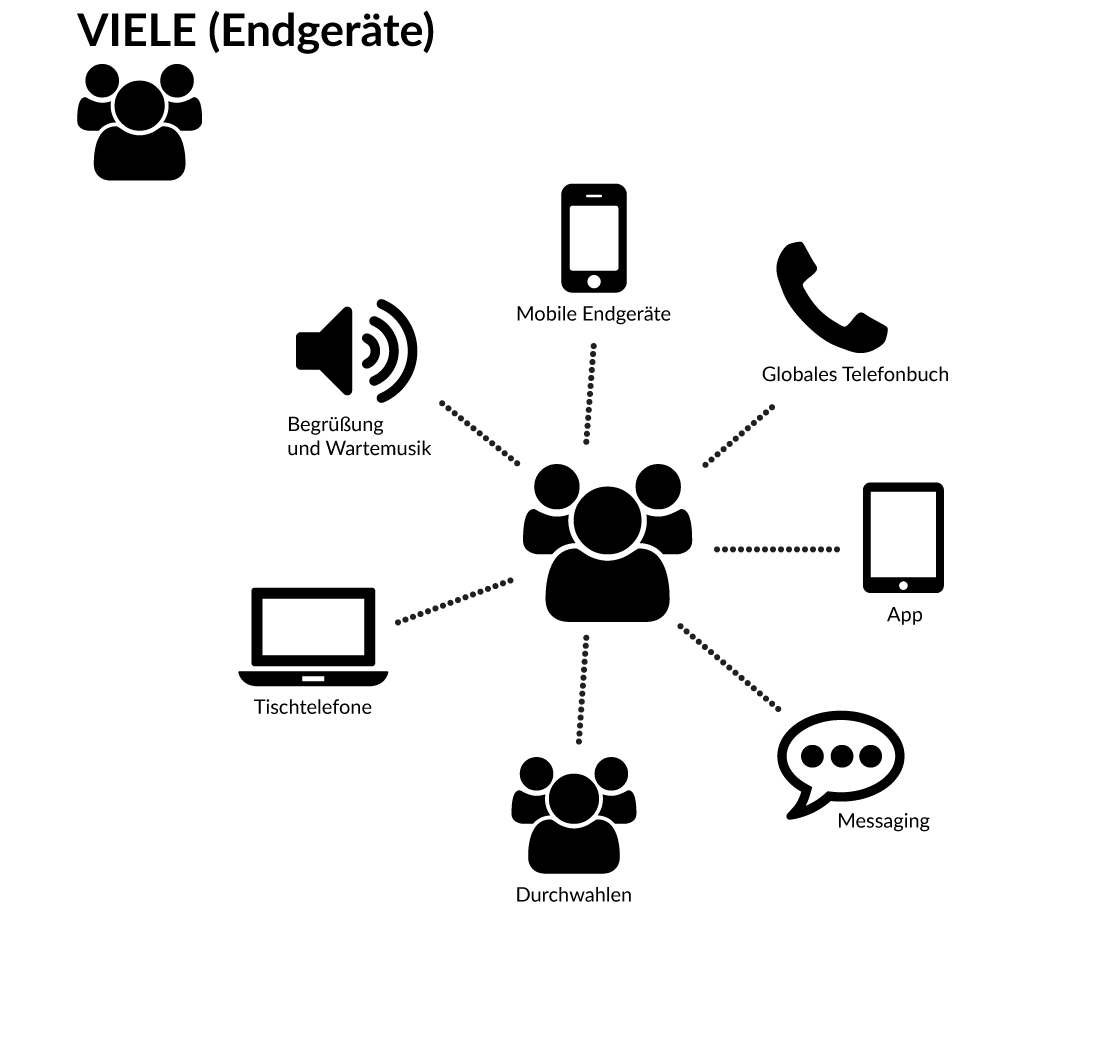 - Erweiterte Funktionen wie intelligente Anrufverteilung, Ursprungsrouting, Notdienst-Funktionen für Ihren eigenen Bereitschaftsdienst, kostenfreie Telefonie zwischen allen Endgeräten, Standorten (auch Ausland) und Benutzer wie z. B. Mobil zu Festnetz, Mobil zu Mobil, Fest zu Fest oder einer beliebigen Kombination.